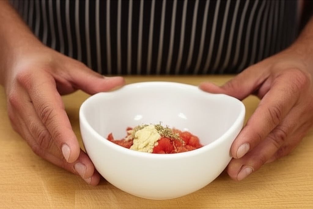 Nagrzej piekarnik do 180°C z termoobiegiem. Pomidora drobno posiekaj, po czym połącz z oregano i przeciśniętym przez praskę czosnkiem. Zamieszaj.