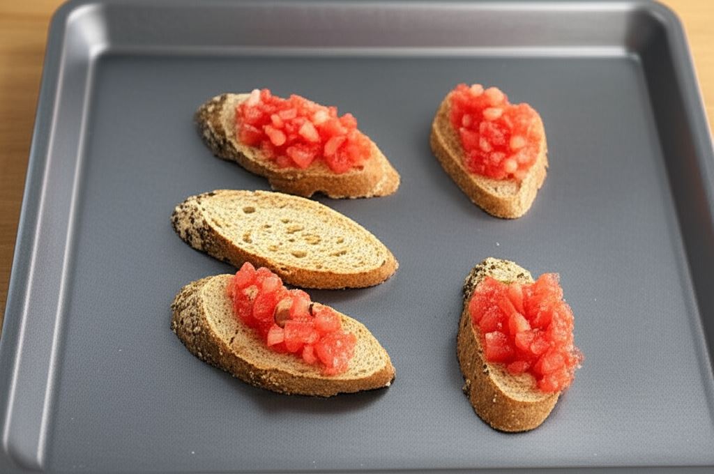 Mieszankę nałóż na kromki bagietki. Zapiekaj przez około 5-8 minut, zależnie od pożądanej chrupkości bagietki.