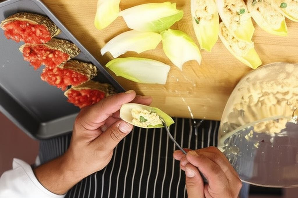 Oddziel liście cykorii, po czym je opłucz. Gotową pastę nałóż na liście, udekoruj posiekanymi orzechami włoskimi.