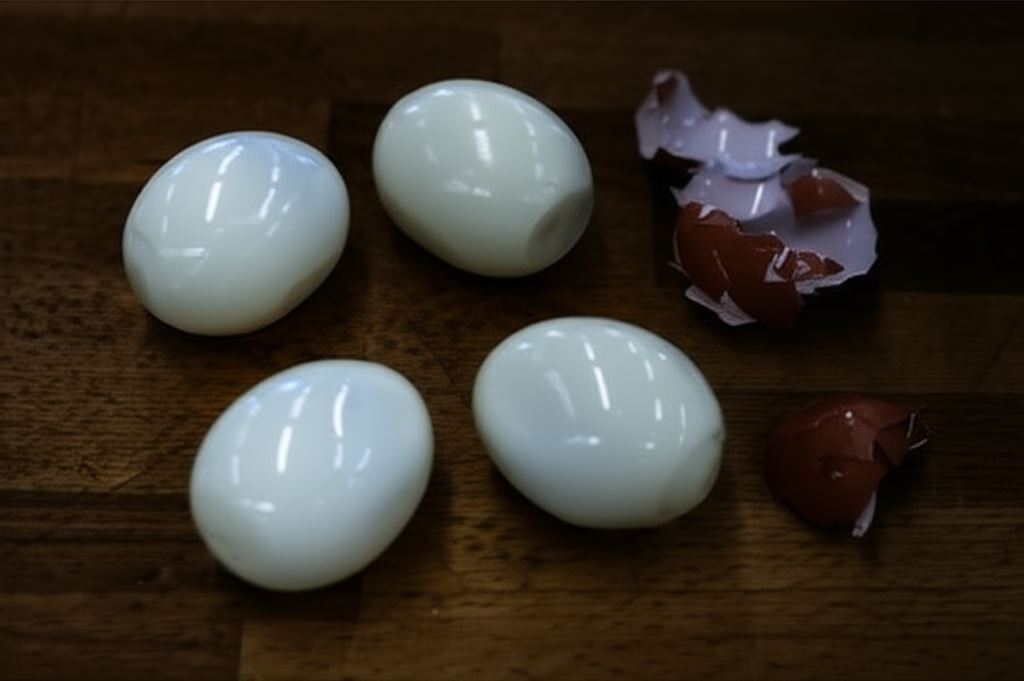 Jajka ugotuj na twardo, potem wystudź i obierz ze skorupek. Pamiętaj, by jajek nie gotować zbyt długo – wówczas żółtka uzyskają siny kolor.