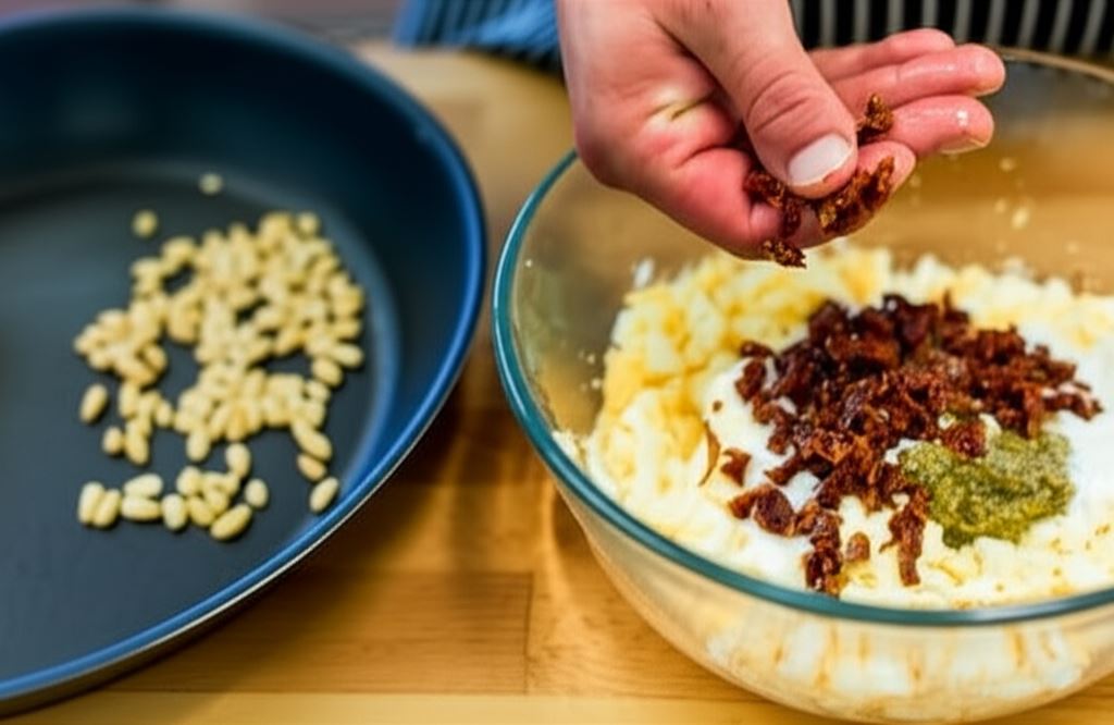 Możesz eksperymentować z dodatkami – zamiast orzeszków piniowych sprawdzą się orzechy nerkowca lub ziarna słonecznika. Pasta świetnie smakuje jako nadzienie do wydrążonych pomidorów lub jaj faszerowanych. Podawaj ją z różnymi rodzajami pieczywa, krakersami, nachosami lub pokrojonymi warzywami dla większej różnorodności.