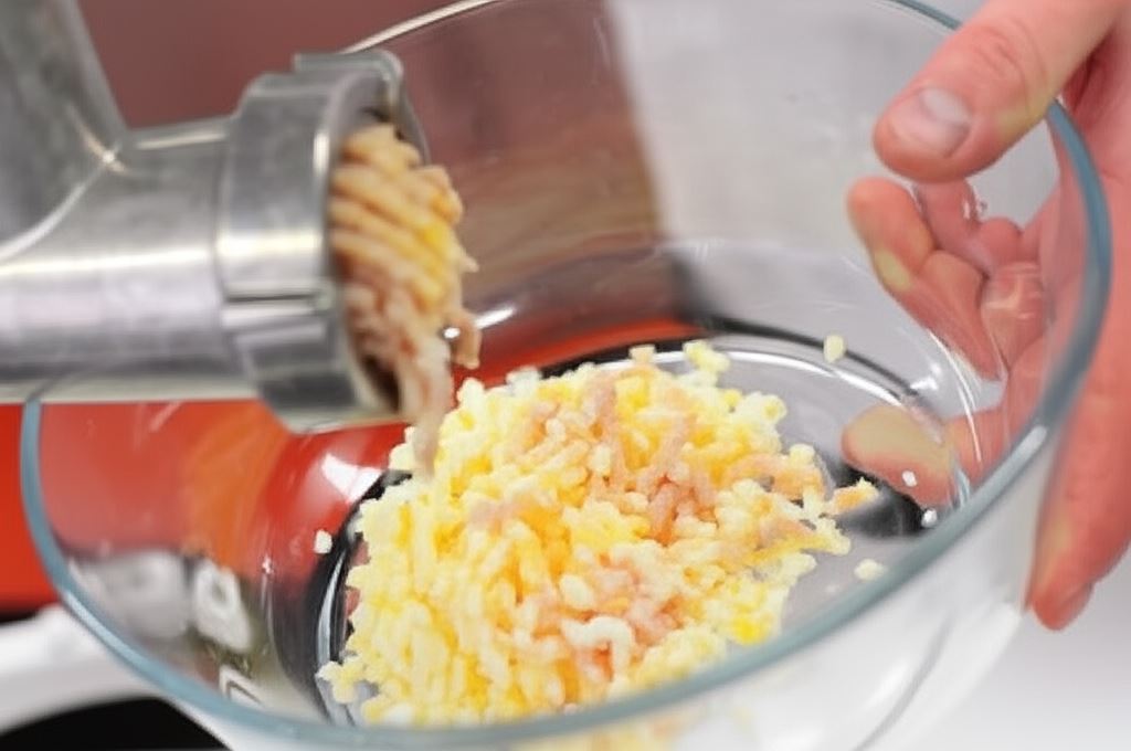 Przepuść szynkę i jajka przez maszynkę.