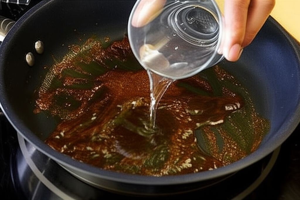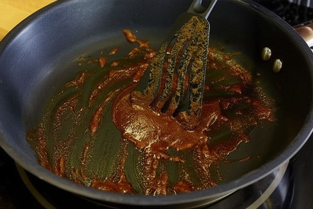 Płaską łyżką (najlepiej drewnianą) zbieraj przyprawy z dna i odczekaj, aż wszystko zacznie się delikatnie smażyć.