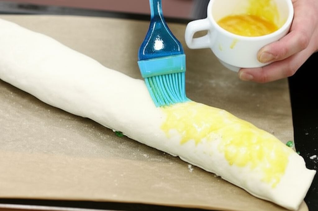 Całość zroluj razem, umieść roladę na blasze wyłożonej papierem do pieczenia, posmaruj od góry roztrzepanym jajkiem. Piecz w piekarniku rozgrzanym do 200° C przez około 25 minut.
