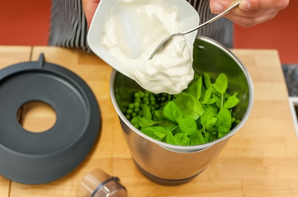 Zielony groszek zalej wrzątkiem, umieść w blenderze i wsyp miętę, bazylię oraz majonez. Wszystko zmiksuj starannie, po czym przecedź przez drobne sitko, aby na sitku zostały twarde fragmenty grochu i ziół.
