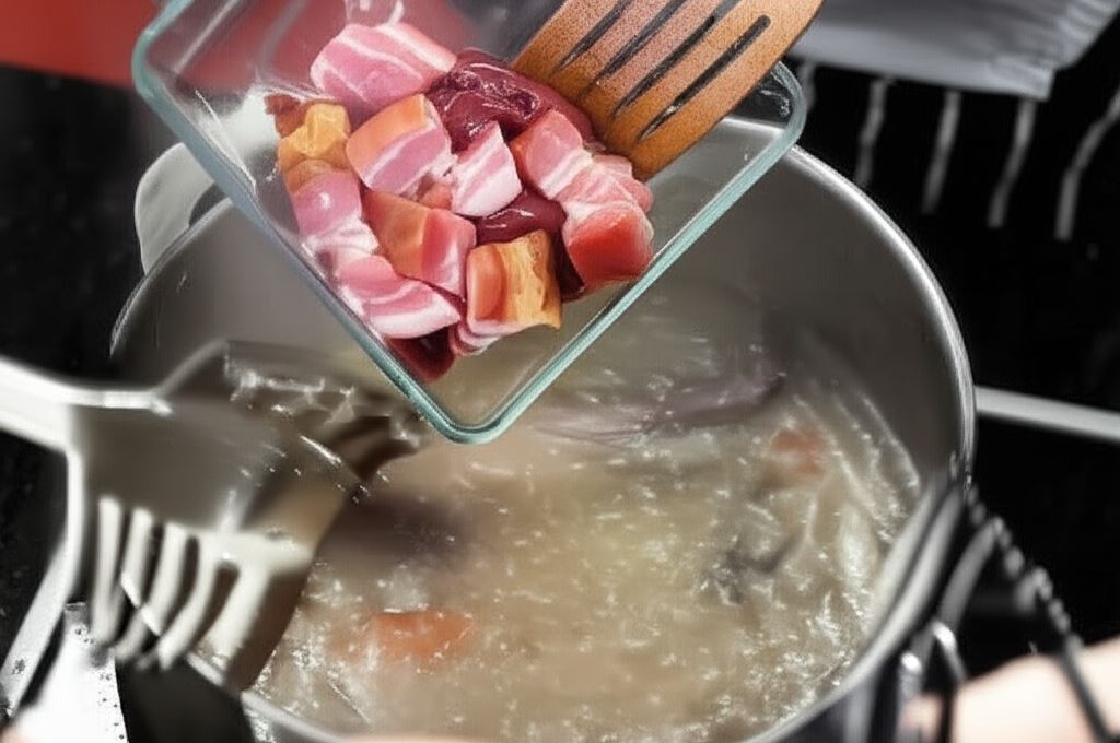 Dorzuć potem pokrojony na duże kawałki boczek oraz wątróbki. Gotuj całość aż zmięknie, po czym odstaw do ostygnięcia.