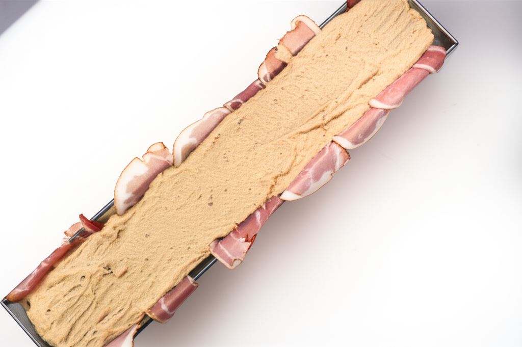 Naczynie do pieczenia (keksówkę) wyłóż pokrojonym na plastry boczkiem. Przygotowaną masę przełóż do naczynia, wyrównaj i umieść w rozgrzanym piekarniku do 180 stopni i piecz około 45 minut. Ostudzony pasztet wyjmij z naczynia.
