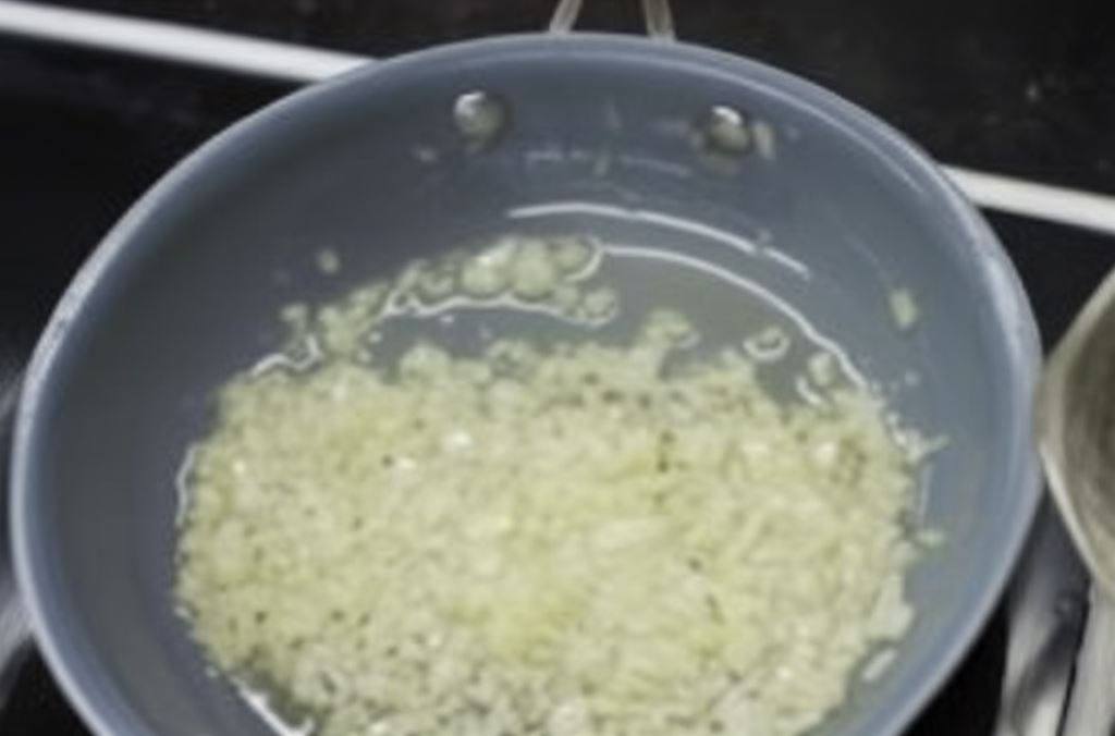 Ugotuj ryż. Cebulę obierz, pokrój w kostkę i podsmaż.