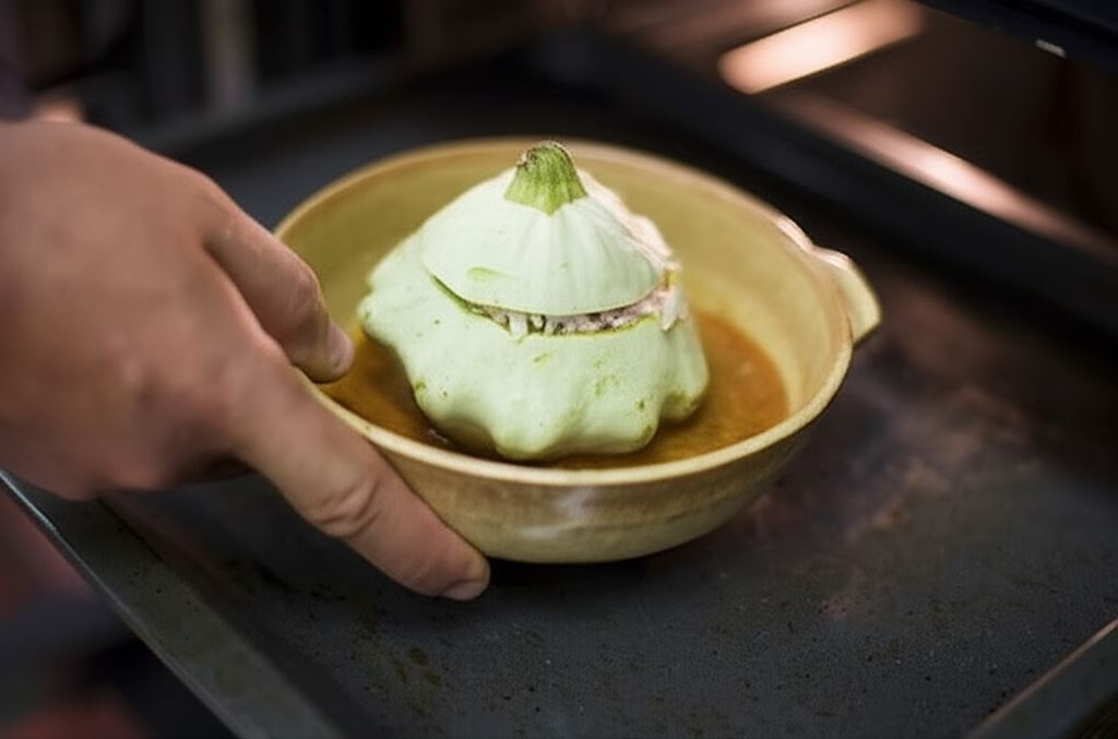 Wypełnij patisony farszem i nakryj ich górnymi częściami. Umieść w naczyniu żaroodpornym.