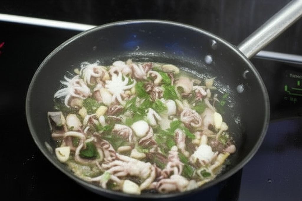 Na rozgrzanej oliwie zrumień posiekany czosnek i wsyp owoce morza. Całość razem krótko obsmaż. Potem dodaj posiekaną natkę pietruszki.