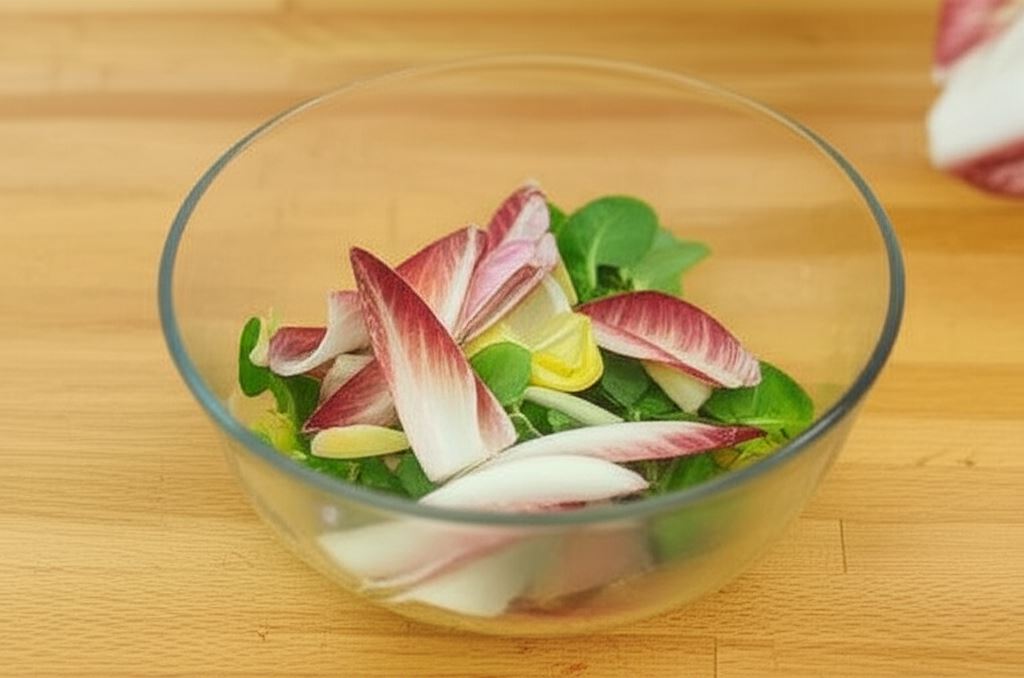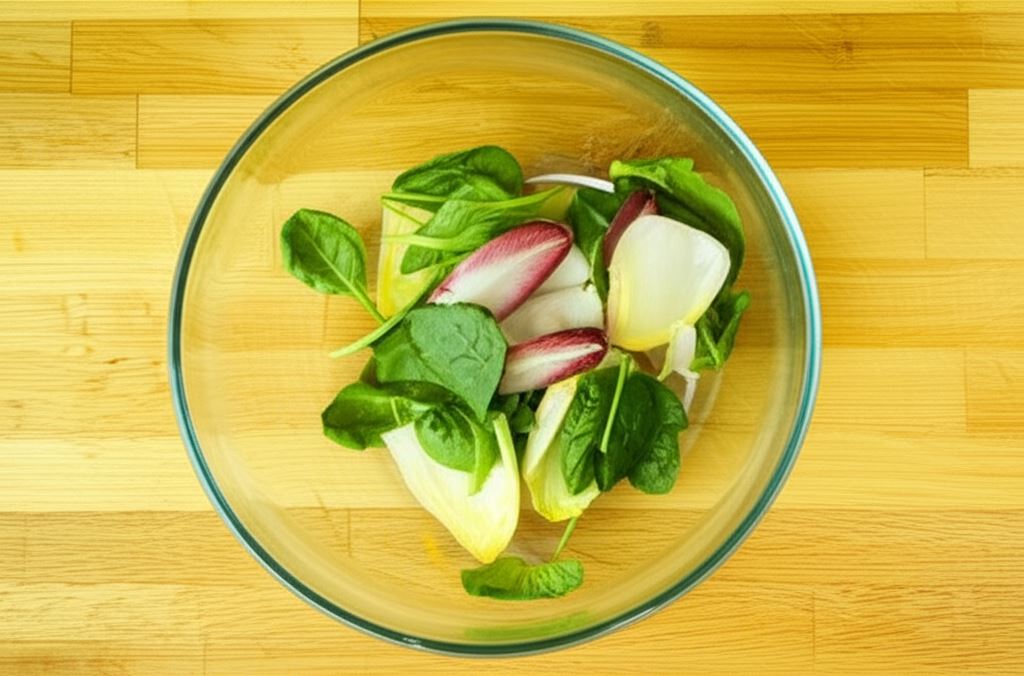 Opłucz i osusz szpinak. Cykorię podziel na pojedyncze liście i połącz całość w misce na sałatkę.