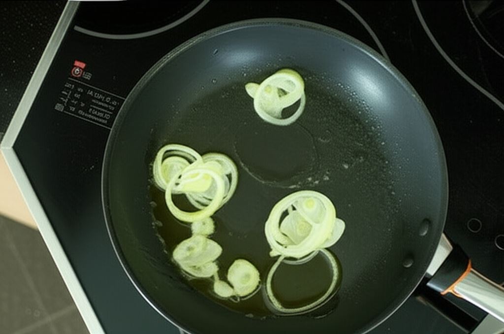 Makaron ugotuj na półtwardo. Na rozgrzanym tłuszczu przesmaż plasterki cebuli.