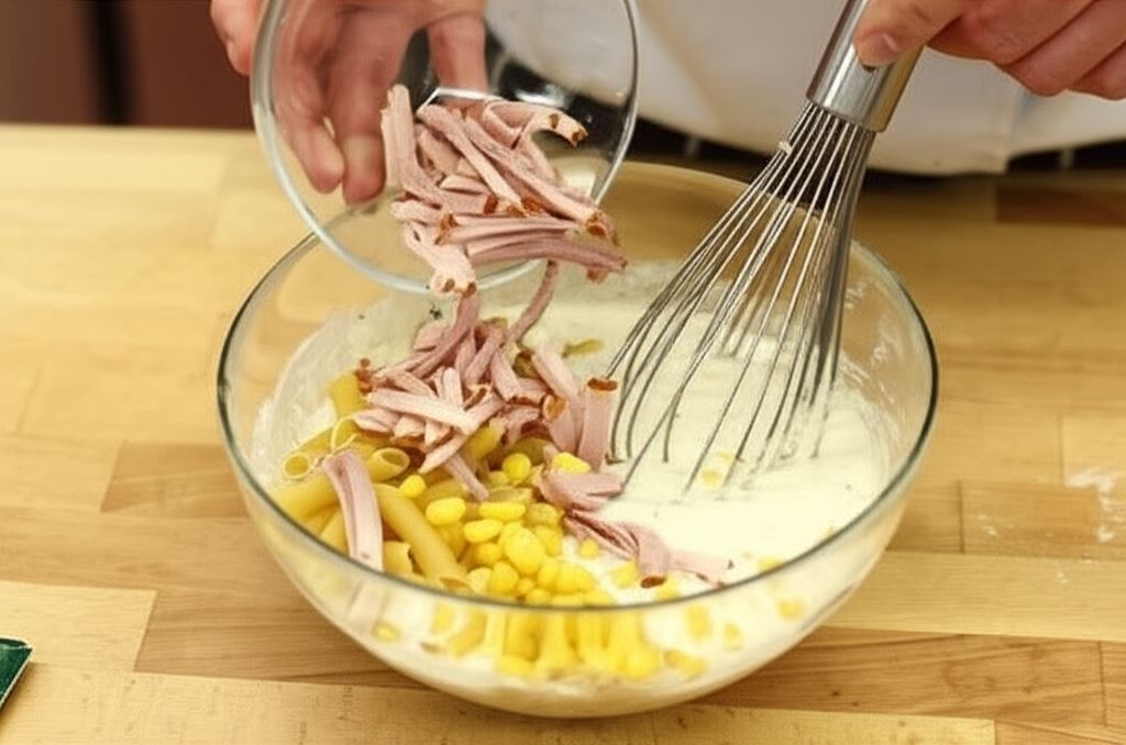 Dorzuć pokrojoną na paski szynkę i kukurydzę konserwową. Całość połącz z surowym makaronem.