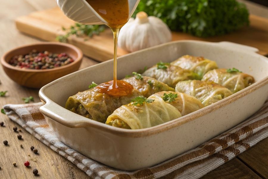 Prawidłowe polanie gołąbków sosem przed pieczeniem wymaga równomiernego rozprowadzenia – sos powinien pokrywać każdą sztukę, ale nie zalewać ich całkowicie. Pozostaw około 1/3 gołąbka na wierzchu, aby kapusta mogła się delikatnie przyrumienić.