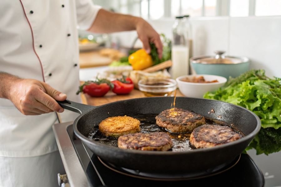 Proces smażenia kotletów burgerowych na patelni