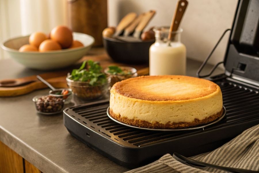 Grill elektryczny powinien być rozgrzany do temperatury 160-170°C przed umieszczeniem sernika. Kluczowe jest równomierne rozprowadzenie ciepła, dlatego warto używać grilla z termoobiegiem. Czas grillowania wynosi około 35-45 minut, w zależności od grubości sernika. Prawidłowo upieczony sernik powinien mieć lekko złocisty wierzch i delikatnie sprężystą konsystencję przy dotknięciu.