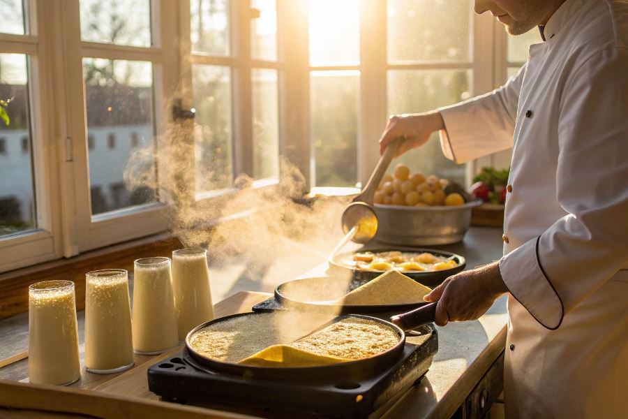 Moment przewracania naleśnika jest kluczowy – brzegi powinny lekko odstawać od patelni, a powierzchnia stracić połysk (zwykle po 1-2 minutach). Do przewracania najlepiej używać cienkiej, elastycznej łopatki lub wykonać efektowny podrut w powietrzu.