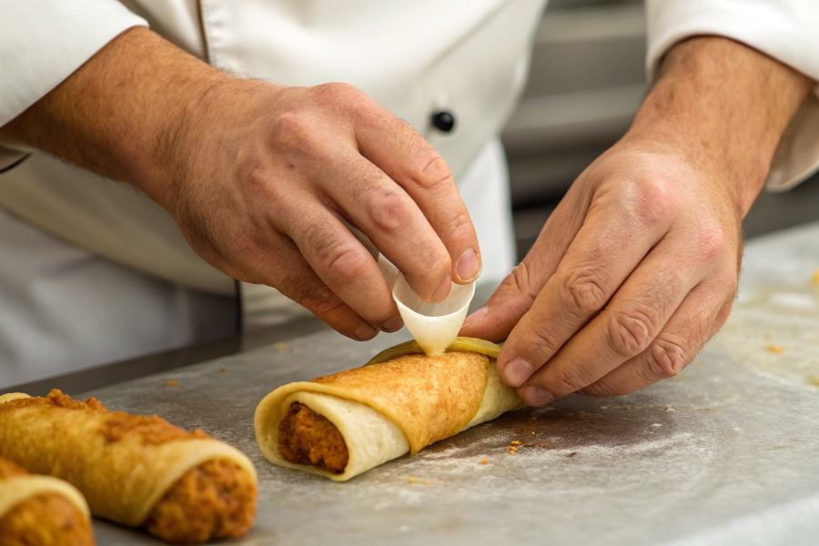 - Zawijaj krokiety delikatnymi, ale zdecydowanymi ruchami – najpierw złóż boki do środka, a następnie zwiń całość w rulon