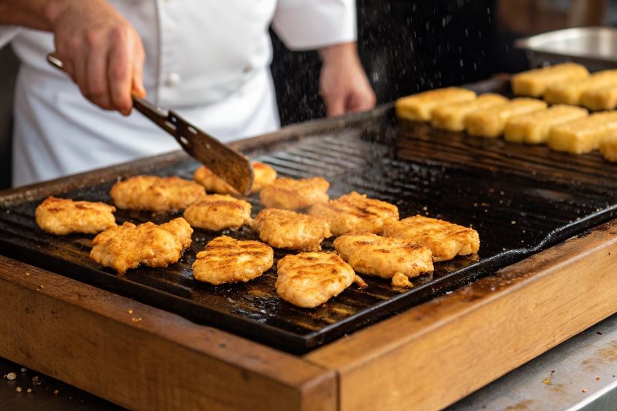 Sekret profesjonalnej panierki to podwójne panierowanie z 15-minutowym odpoczynkiem między warstwami, co zapewnia idealną przyczepność podczas grillowania.