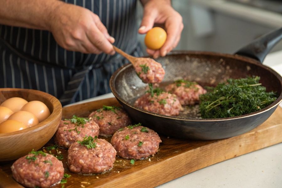 Kluczowy trik: dodanie 2-3 łyżek zimnej wody lub mleka do masy mięsnej tuż przed końcem wyrabiania tworzy emulsję tłuszczowo-wodną, która zamyka soki w mięsie podczas smażenia.