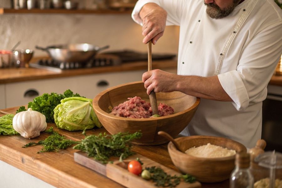 Kluczowym elementem jest zawartość tłuszczu na poziomie 15-20% – zbyt chude mięso spowoduje wysuszenie farszu podczas gotowania. Mięso powinno być świeże, schłodzone, nie mrożone, co gwarantuje lepszą strukturę i soczystość gotowego dania.