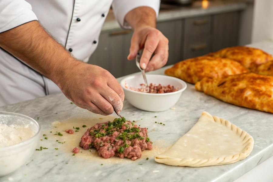 Tradycyjny farsz do czebureki zyskuje głębię smaku dzięki starannie dobranym dodatkom. Na każde 500g mięsa mielonego zaleca się: