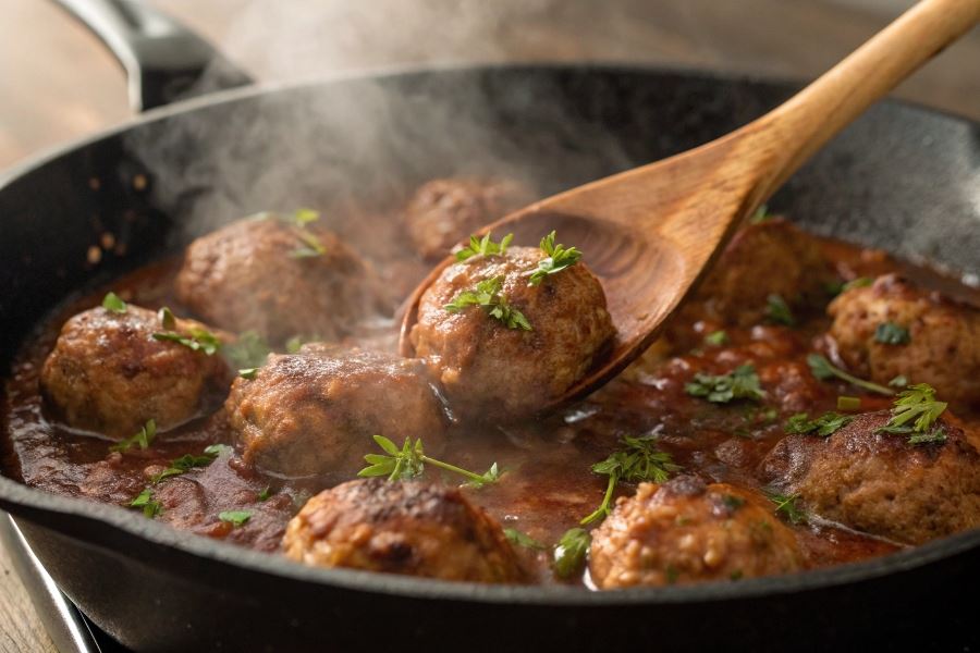 Pulpety duszone w sosie na patelni tworzą kompletne danie jednogarnkowe. Technika ta polega na przygotowaniu sosu bezpośrednio na patelni po obsmażeniu pulpetów, wykorzystując powstałe soki i przypieczone skrawki jako bazę smakową. Pulpety wracają następnie do sosu, gdzie duszą się przez 15-20 minut pod przykryciem, nabierając głębi smaku i miękkości.