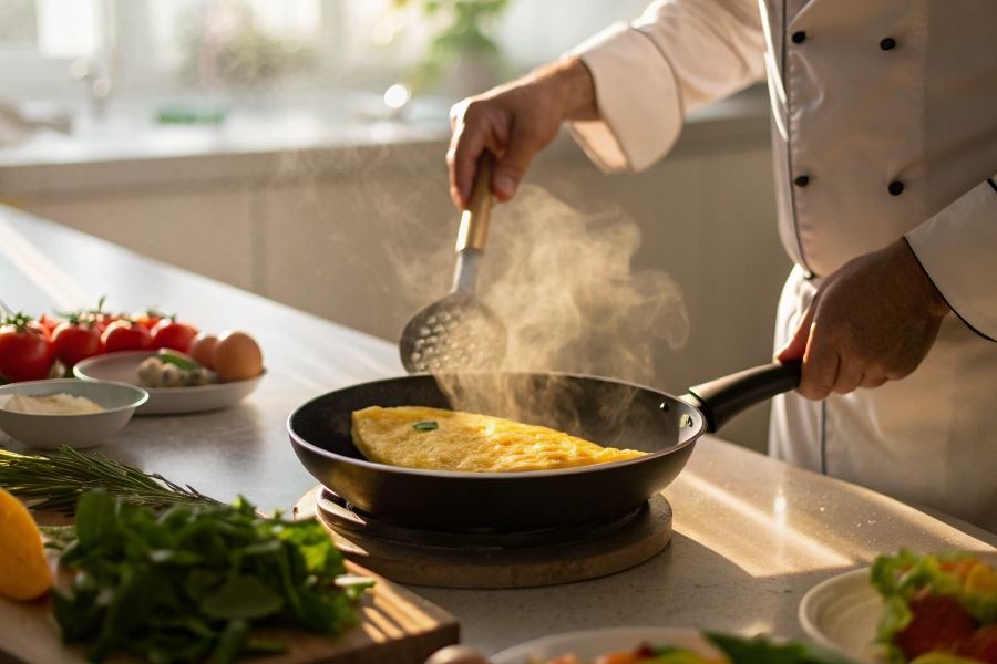 Perfekcyjny omlet zaczyna się od odpowiednio rozgrzanej patelni. Optymalna temperatura to średni ogień – zbyt niska sprawi, że omlet będzie gumowaty, zbyt wysoka – spali go z zewnątrz, pozostawiając surowy środek. Najlepiej rozgrzewać patelnię przez 2-3 minuty przed dodaniem tłuszczu. Do smażenia omletów najlepiej sprawdzają się: