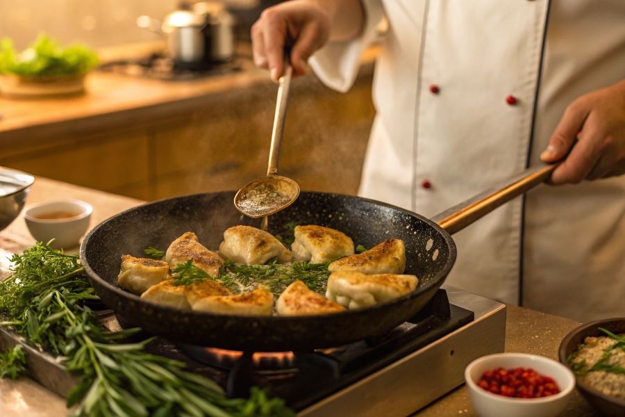 Sekret idealnie smażonych pielmieni tkwi w odpowiedniej temperaturze patelni. Zbyt niska sprawi, że ciasto nasiąknie tłuszczem, zbyt wysoka – spali się, zanim wnętrze będzie gotowe.