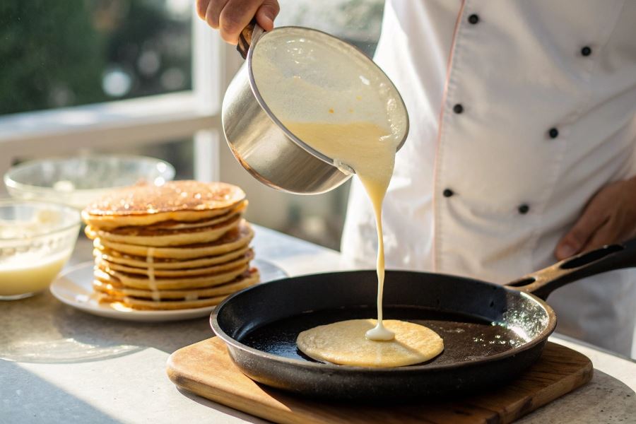 Profesjonalna wskazówka: Odstaw ciasto na minimum 30 minut przed smażeniem. Pozwoli to mące w pełni napęcznieć i uwolnić gluten, co zapobiega rwaniu się naleśników podczas smażenia.