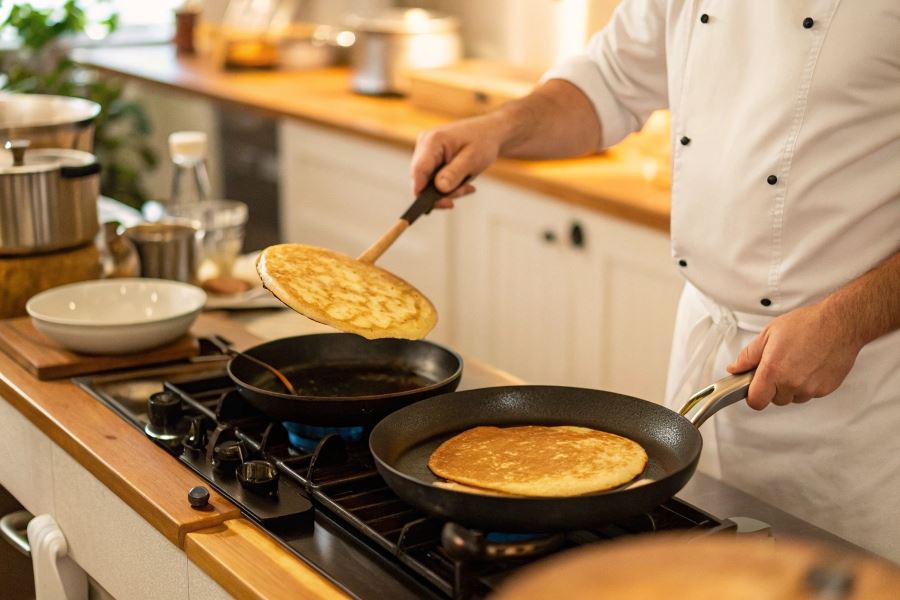 Optymalna temperatura patelni to 180-200°C. Zbyt niska spowoduje, że naleśnik będzie wchłaniał tłuszcz i stanie się ciężki, zbyt wysoka – że przypali się z zewnątrz, pozostając surowym w środku.