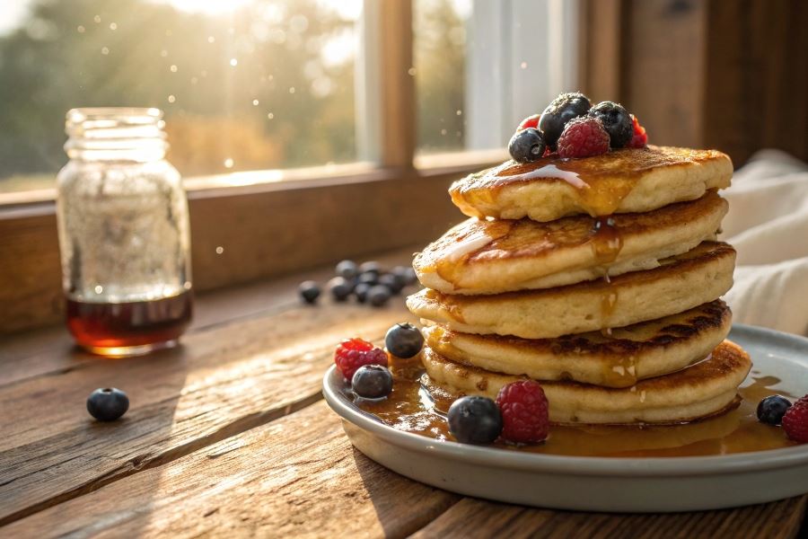Podawaj z syropem klonowym, świeżymi owocami, bitą śmietaną lub domowym dżemem. Jeśli chcesz przechować pankejki na następny dzień, ułóż je w szczelnym pojemniku w lodówce. Odgrzewaj krótko w mikrofalówce lub na suchej patelni, aby odzyskały miękkość i elastyczność.