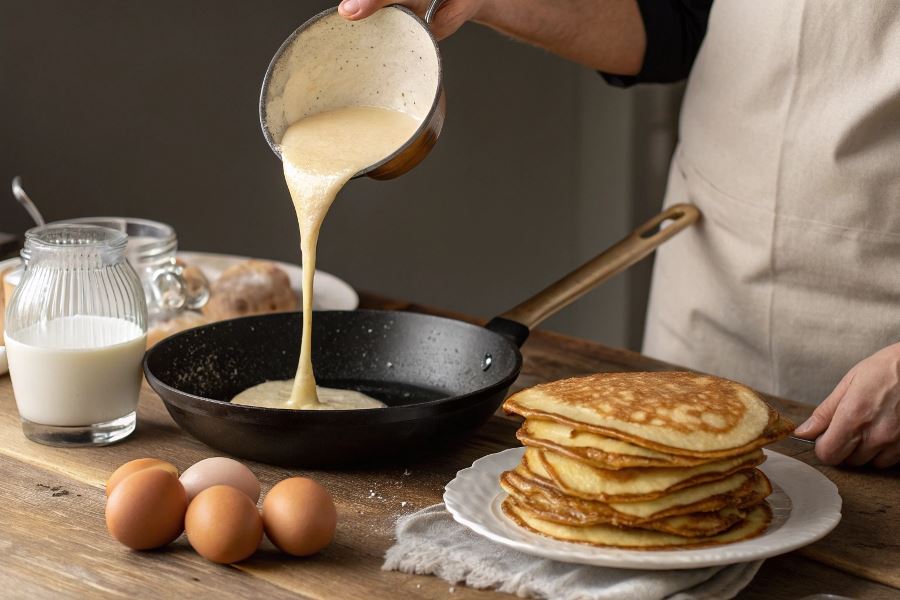 Kluczem do sukcesu jest zachowanie proporcji 1:2 między mąką a mlekiem, co zapewnia idealną konsystencję – ani zbyt gęstą, ani zbyt rzadką. Jajka nadają elastyczność, a olej zapobiega przywieraniu do patelni.