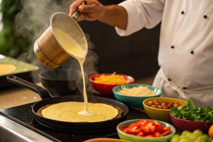 Profesjonalna wskazówka: Aby uzyskać równomierną grubość naleśnika, wlej ciasto na środek patelni i szybkim ruchem nadgarstka rozprowadź je po całej powierzchni, obracając patelnię.
