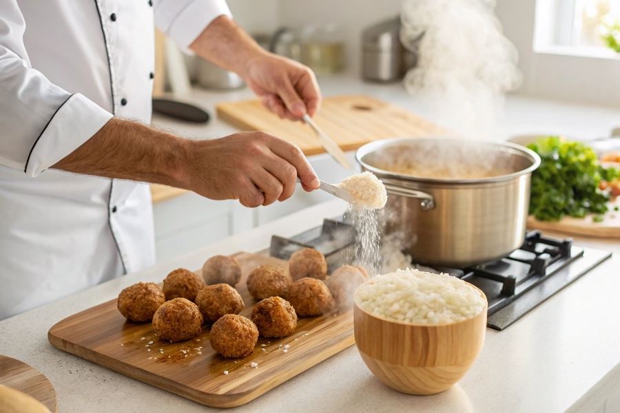 Metoda risotto z podsmażaniem nadaje ryżowi orzechowy aromat. Najpierw podsmaż ryż na maśle przez 2-3 minuty, następnie stopniowo dolewaj gorący bulion, ciągle mieszając. Ta technika wzbogaca smak pulpetów o głębię umami.