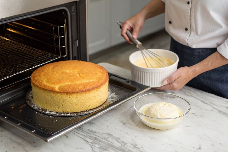 Natychmiast po wyjęciu z piekarnika odwróć formę z biszkoptem do góry dnem. Ta technika zapobiega zapadaniu się ciasta podczas stygnięcia, ponieważ wykorzystuje grawitację do utrzymania struktury, gdy biszkopt jest jeszcze ciepły i elastyczny.