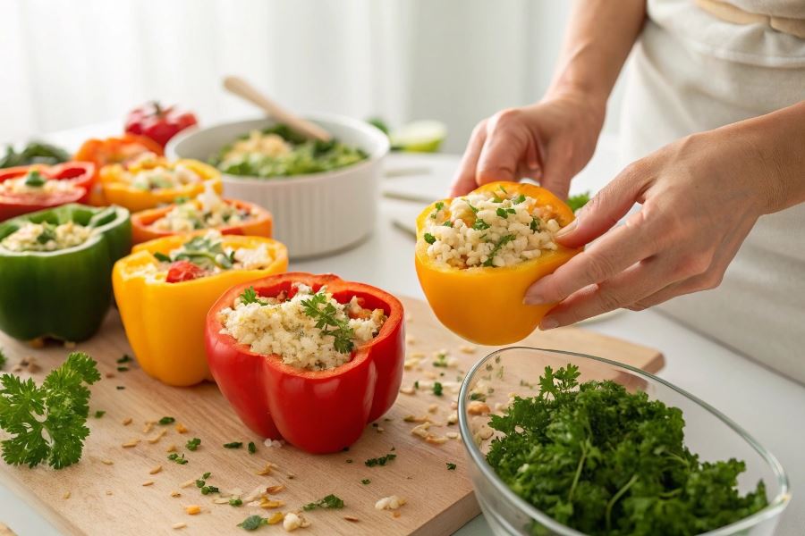 Ekspercka rada: Przed faszerowaniem skrop wnętrze papryki oliwą infuzowaną ziołami, aby wzmocnić śródziemnomorski profil smakowy.