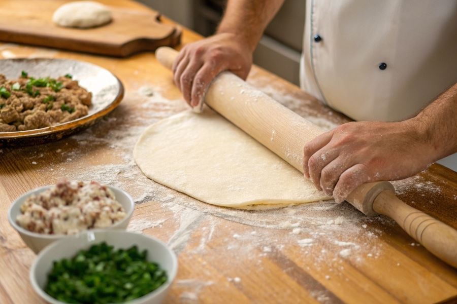Po odpoczynku ciasto jest gotowe do podzielenia na porcje, rozwałkowania i nałożenia nadzienia, by stworzyć autentyczne czebureki o idealnej teksturze – chrupiące z zewnątrz i miękkie wewnątrz.