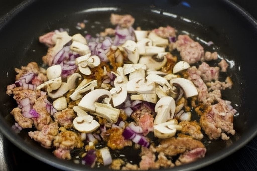 Wrzuć posiekaną w kostkę cebulę i pieczarki pokrojone na ćwiartki. Przypraw do smaku chili.