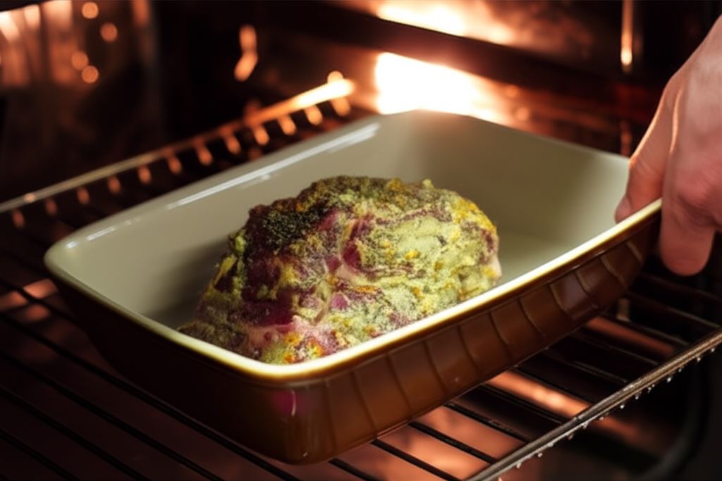Mięso marynuj najlepiej przez całą noc. Potem umieść w piekarniku nagrzanym do 160 °C, dolej szklankę wody i piecz przez 90 minut.