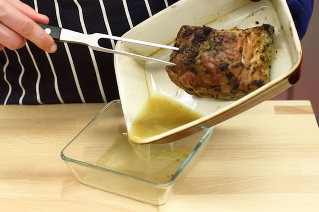 Po wypieczeniu przelej wytworzony sos do miseczki i odstaw mięso na 10 minut.
