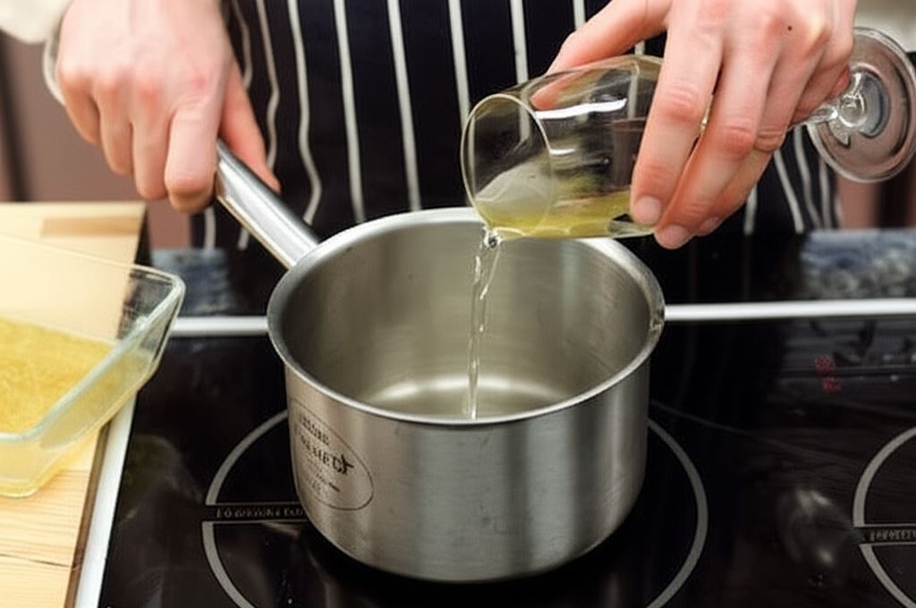 W międzyczasie doprowadź do wrzenia białe wino w rondlu. Kiedy zredukuje się o połowę, dodaj sos powstały z pieczenia mięsa.