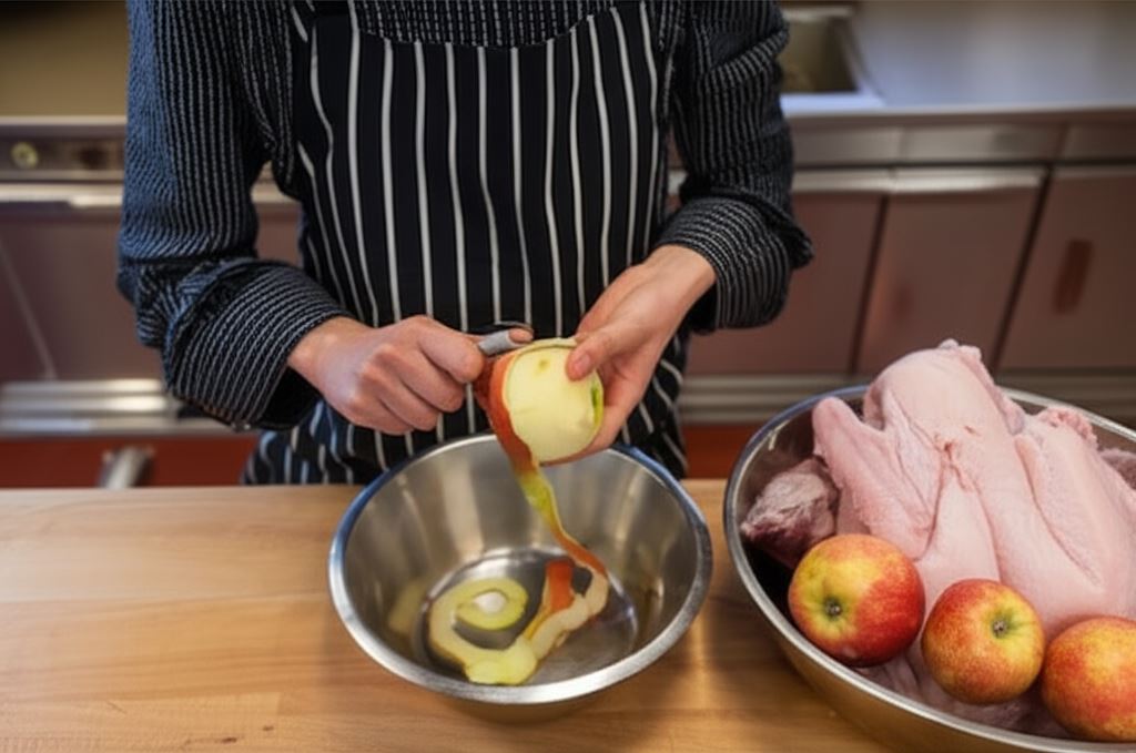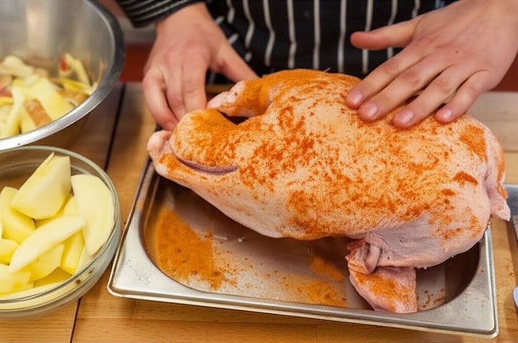 Sekret doskonałej gęsi tkwi w odpowiednim przygotowaniu. Natarcie mięsa przyprawami zarówno na zewnątrz, jak i wewnątrz, oraz wypełnienie wnętrza obierkami z jabłek i czosnkiem nadaje potrawie głęboki, wielowymiarowy smak. Powolne pieczenie w niskiej temperaturze sprawia, że mięso staje się niezwykle delikatne, a tłuszcz wytapia się, tworząc naturalny sos do podlewania.
