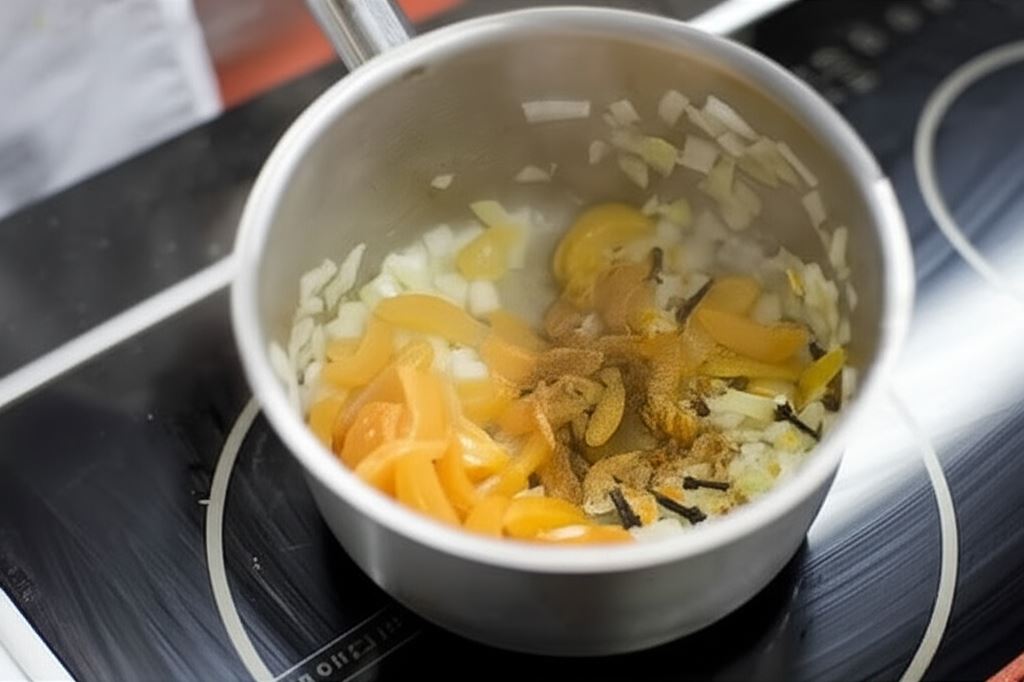 W rondelku zrumień drobno posiekaną cebulę, wsyp starty imbir, skórkę z pomarańczy, pokrojone kawałki moreli, cynamon i goździki.