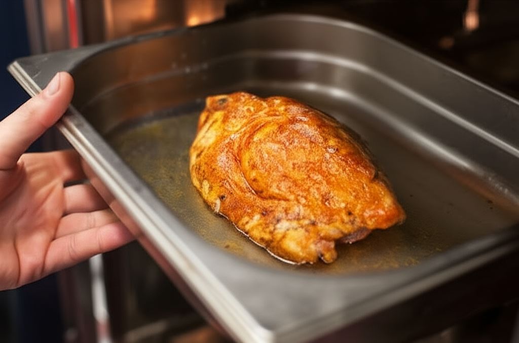 Mięso przenieś na blachę, zalej niepełną szklanką wody, piecz w nagrzanym do 190°C piekarniku przez około 90 minut.