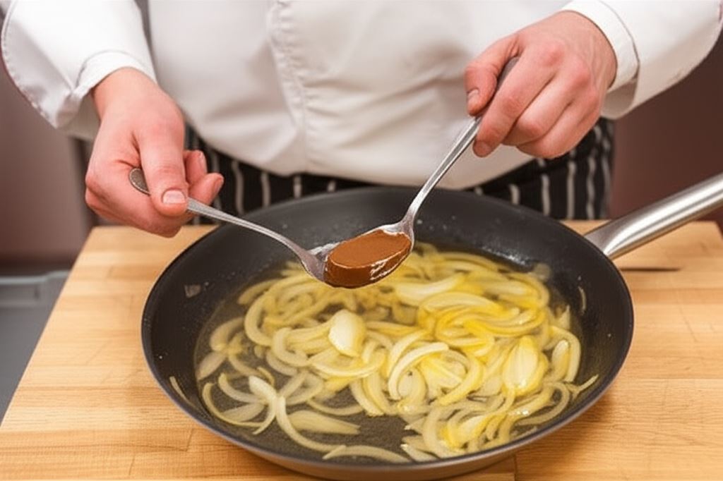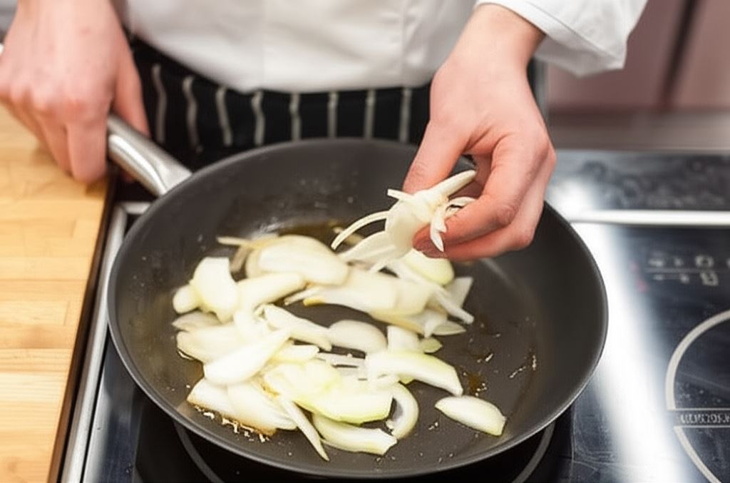 Na tej samej patelni, gdzie mięso było pieczone, na rozgrzanym tłuszczu zrumień pokrojoną w piórka cebulę.