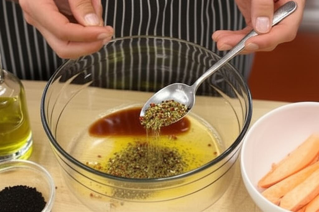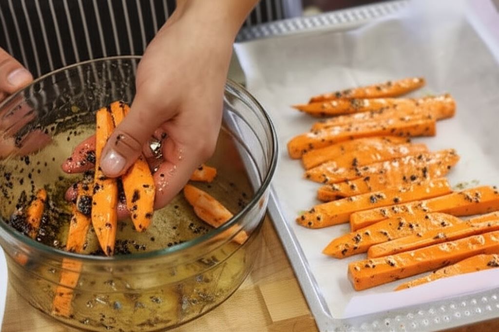 Bataty opłucz, obierz, potnij w grube patyczki i obtocz w oliwie, przyprawie, nasionach sezamu i syropie klonowym.