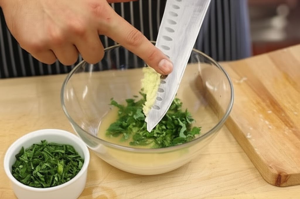 Posiekaj pietruszkę i kolendrę, wyciśnij sok z cytryny, czosnek obierz i rozetrzyj na desce z 1/2 łyżeczki soli.