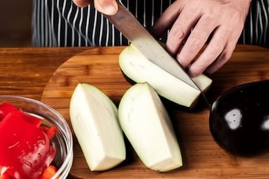 Przekrój paprykę i bakłażany wzdłuż na cztery części.