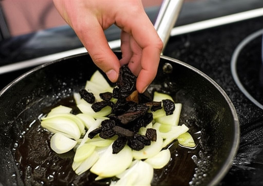 W międzyczasie na patelni zrumień cebulę, wsyp pokrojone śliwki.